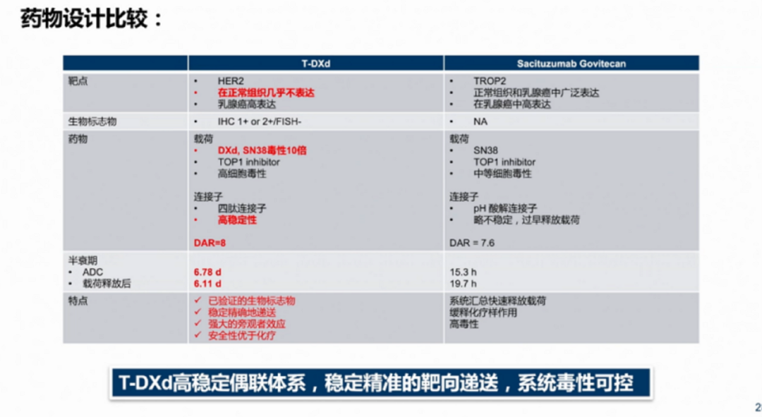 陈占红教授指出,T-DXd正常组织中几乎不表达,其四肽连接子具有较高的稳定性,ADC半衰期以及载荷释放后的半衰期分别较长(分别为6.78d和6.11d),这些药物特征使其能稳定偶联、精准递送,疗效得到提高、毒副作用可控。