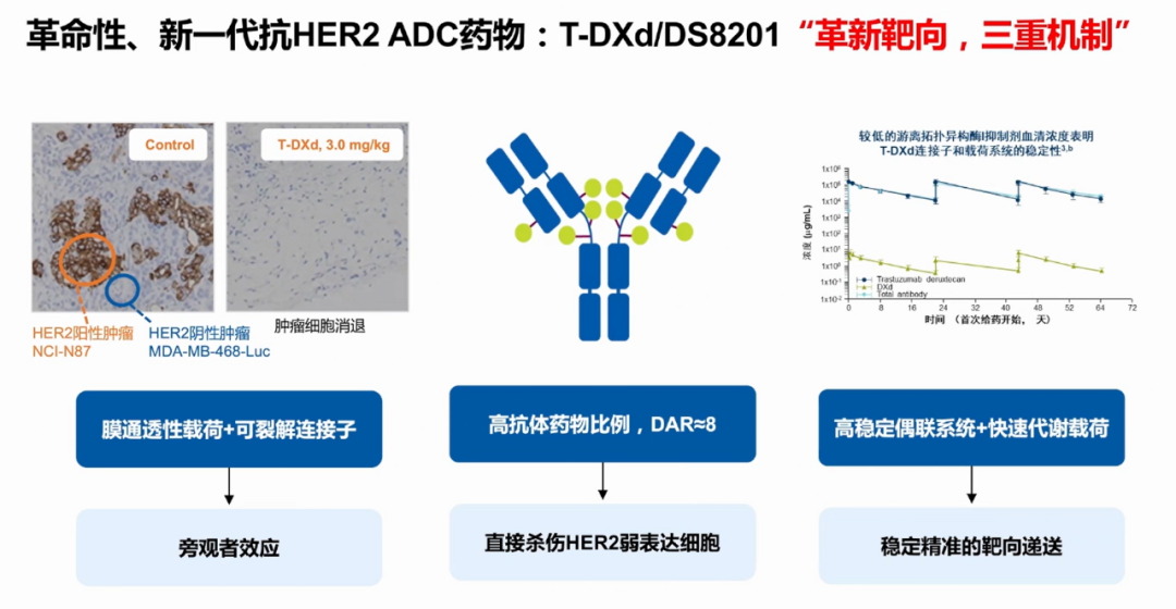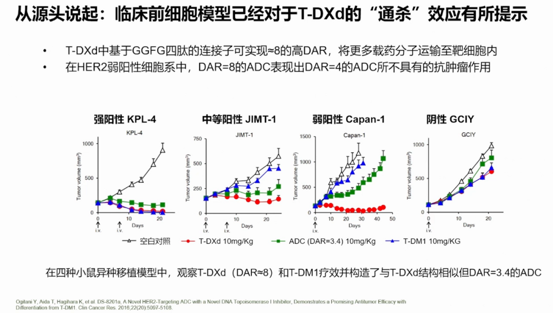 梁旭教授指出,HER2通路抑制剂的获益人群主要集中在HER2高表达人群,而HER2低表达仍可作为靶向输送化疗药物的标记靶点。T-DXd作为新一代抗体偶联药物(ADC),基于GGFG四肽的连接子可实现高达≈8的药物抗体比(DAR),将更多载药分子运输至靶细胞内,且连接子裂解后T-DXd可发挥强大的抗肿瘤“旁观者效应”。因此,在临床前细胞模型中,T-DXd展现出“通杀”效应,对HER2表达强阳性、中等阳性、弱阳性模型均表现出肿瘤抑制作用。