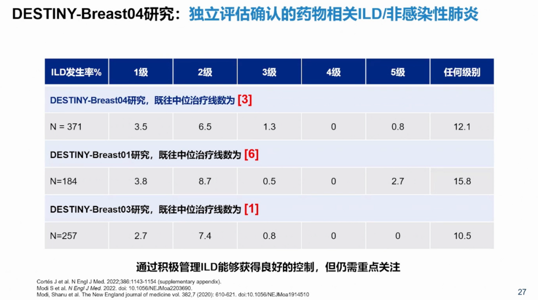 针对临床最为关心的间质性肺疾病(ILD)/非感染性肺炎事件,该研究中任何级别的此类事件发生率为12.1%,但大部分为1-2级轻度事件(10.0%)。梁旭教授指出,结合DESTINY-Breast01、DESTINY-Breast03研究来看,ILD/非感染性肺炎事件仍有一定程度发生比例(>10%),而且可能治疗线序越靠后,发生严重事件的风险更高,比如DESTINY-Breast01研究中≥3级事件率为3.2%。因此,临床上要给予一定的关注和监测,做到充分评估和预防,早期诊断、早期治疗。