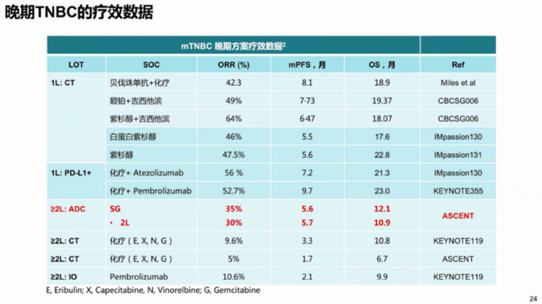 在mTNBC领域,化疗单药或联合用药一线治疗的PFS大约在5.5~8.0个月,中位OS大约在18~22个月,化疗联合免疫治疗(PD-L1+)可将PFS延长至7.2~9.7个月,OS延长至21~23个月。在≥2线治疗中,化疗的PFS不足4个月,OS不足1年。ASCENT研究中,靶向于Trop-2的ADC药物SG则可获得5.6个月的PFS和12.1个月的OS。
