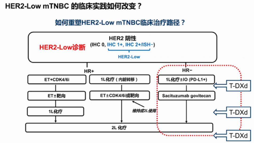 随着T-DXd在HER2低表达领域取得的巨大突破,CSCO和CACA指南已经明确提出此类患者的定义。尽管HER2低表达约占全体乳腺癌的50%左右,但传统的抗HER2治疗对此类患者无效,目前主要归入HR+/HER2-和TNBC的治疗范畴,后线治疗选择十分有限。