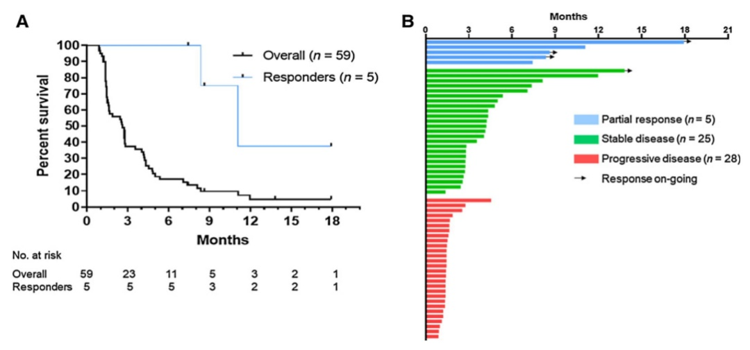 全组患者ORR为8.5%,研究未达到其预设的研究终点,中位PFS为2.8个月,12个月PFS率为4.8%,中位OS为11.0个月,12个月OS率为46.4%。