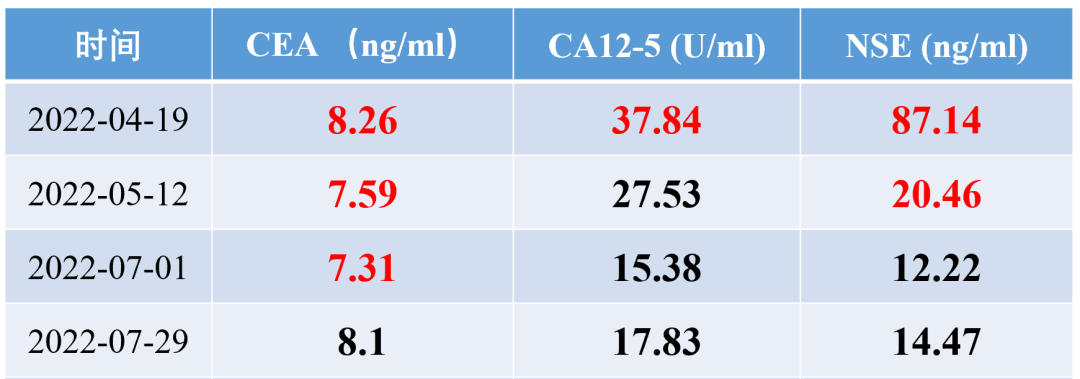 入院检验检查:血常规、尿常规、粪常规正常,心电图、肝肾功未见异常。血清肿瘤标志物(2020-04-17):CEA 8.26 ng/mL,CA12-5 37.84 U/mL,NSE 87.14 ng/mL。