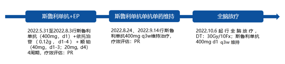 2022.5.31至8.3接受斯鲁利单抗400mg,d1+依托泊苷0.12g,d1-4+顺铂40mg,d1-3;20mg,d4 q3w治疗,共4个周期;2022.8.24、9.14接受斯鲁利单抗400mg q3w维持治疗2个周期。