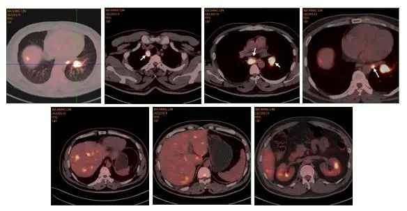 PET-CT(2022.5.19):左下肺背段近肺门分叶状结节,约3.0×2.3cm,放射性摄取异常增高,SUVmax=11.4;右上气管旁、隆突下、后纵隔降主动脉左前及左侧肺门肿大淋巴结,大者2.4*1.9cm,放射性浓聚,SUVmax=11.5。肝内散在多发略低密度影,边界不清,放射性摄取增高,SUVmax=7.0。