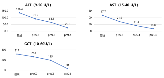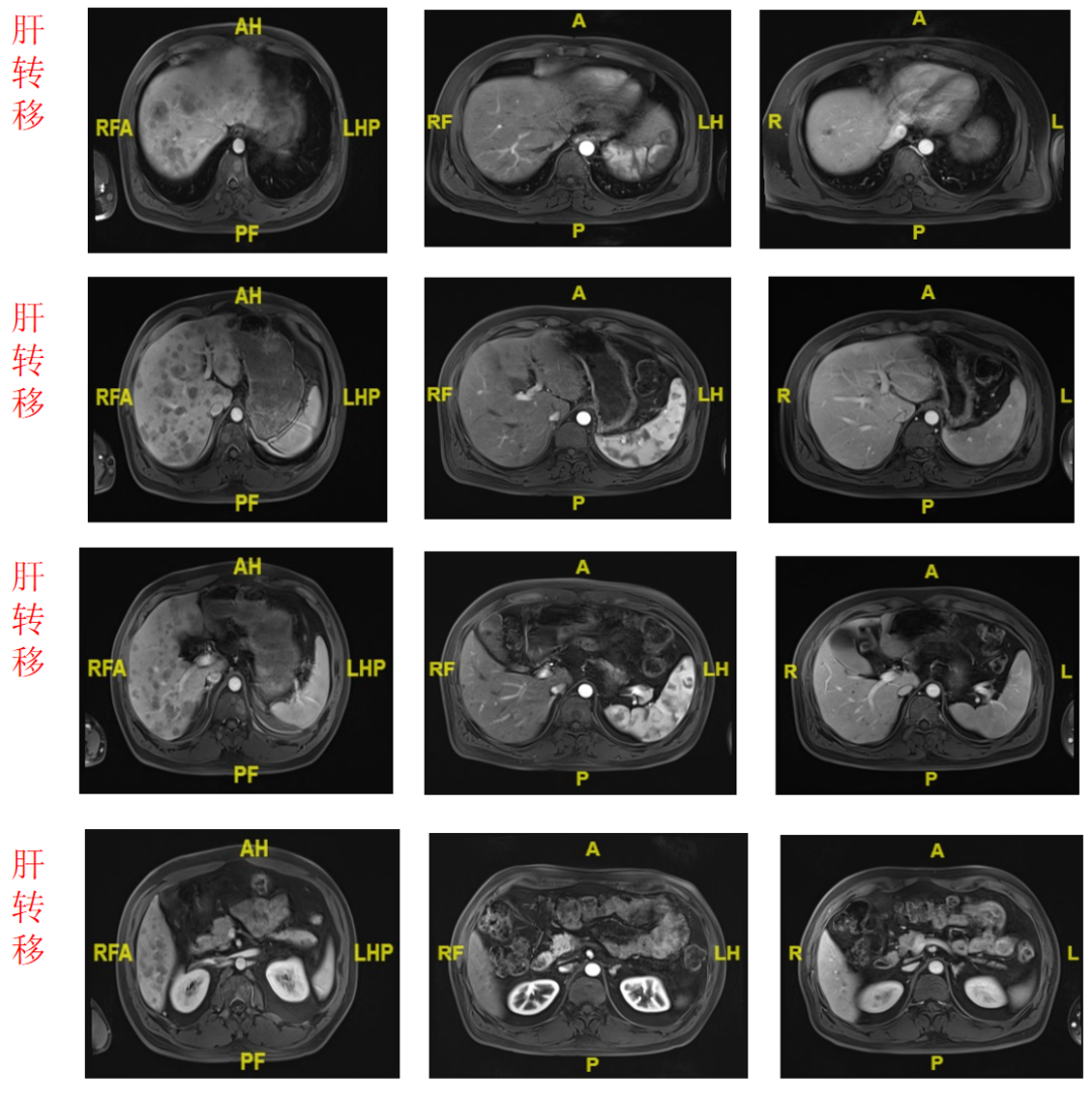 MRI(2022.7.6):肝脏表面光滑,肝脏多发T1WI低信号、T2WI略高信号结节,较前稍缩小减少,大者约17mm,增强后呈轻度强化,肝胆排泄期强化退出,肝内外胆管无扩张。胸腰椎多发转移部分稍缩小。