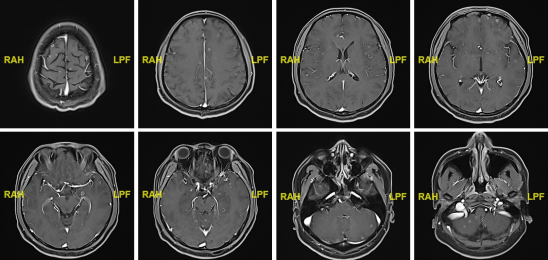 随访:2022.09.23脑MR提示大脑及小脑内多发强化结节,大者约8mm,脑内多发转移。