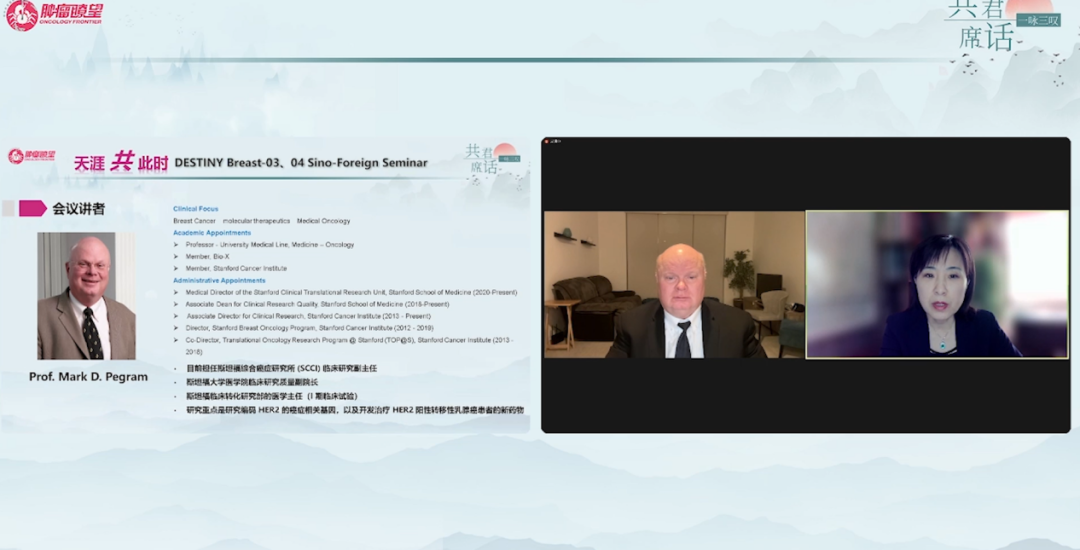 编者按:风好正是扬帆时,奋楫逐浪天地宽。为传递乳腺癌诊疗最新进展,加强中外乳腺癌治疗领域专家的沟通交流。日前,江苏省人民医院殷咏梅教授、北京大学肿瘤医院宋国红教授与斯坦福综合癌症研究所Mark D.Pegram教授、华中科技大学附属协和医院赵艳霞教授、浙江大学医学院附属一院沈朋教授、广东省中医院大学城医院许锐教授共同带来了一场别开生面的“中外专家研讨会”,就DESTINY-Breast03、DESTINY-Breast04研究相关数据进行了介绍,本次会议进一步促进了广大医务工作者对HER2-low乳腺癌治疗的深入理解,也对T-DXd这一药物有了进一步的认识。