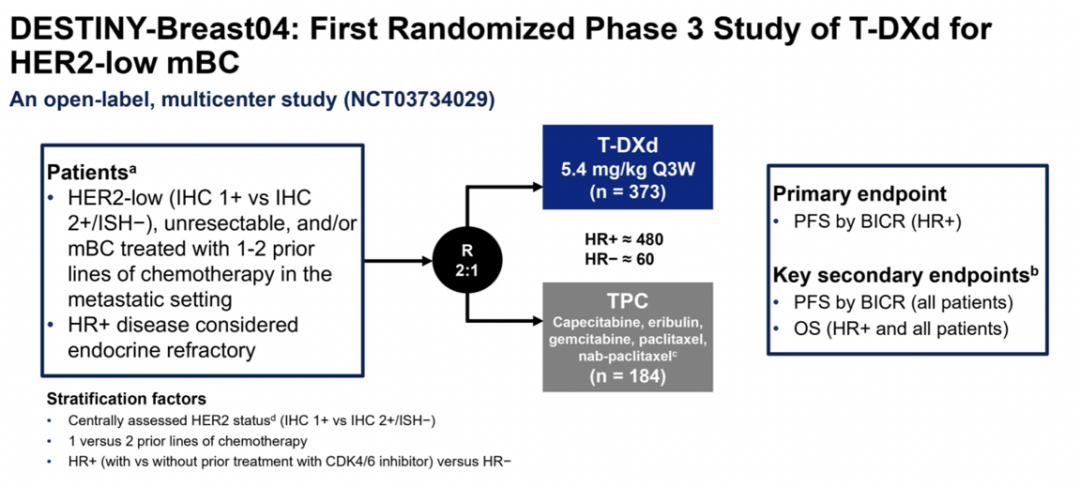 DESTINY-Breast04(DB-04)研究是首个探讨T-DXd治疗HER2-low mBC的Ⅲ期临床试验,将入组患者被随机分到T-DXd或医生选择的化疗方案(TPC)组分别接受治疗,结果显示,与TPC组相比T-DXd可显著延长HR+/HER2-low患者的PFS(10.1个月vs 5.4个月;P<0.0001)和所有患者的mPFS(9.9个月vs 5.1个月,P<0.0001),OS也有显著的延长。探索性分析显示,T-DXd组也能够显著改善HR-/HER2-low患者的PFS和OS。