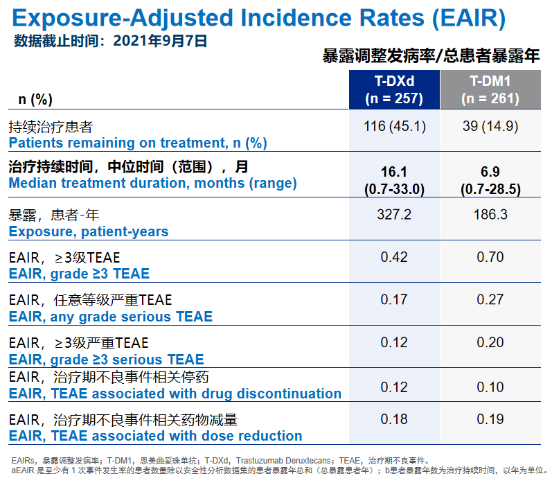 2022年ASCO大会上公布的DB-03研究的安全性随访数据,进一步支持了T-DXd在HER2+mBC中的应用。结果显示,与T-DM1组相比,T-DXd的中位治疗时间更长(16.1个月vs 6.9个月),T-DXd的TEAE总体可控,最常见导致治疗停药的TEAE中,T-DXd组为ILD/非感染性肺炎,T-DM1组为血小板减少症。T-DXd首次出现TEAE时间相对较晚(96天vs 19天),且在T-DXd治疗早期,患者首次发生恶心、呕吐、脱发的风险更高,两组疲劳和脱发的累积发生率和趋势相似。通过对治疗持续时间进行校正,发现T-DXd组的不良事件相对较少。调整后,T-DXd治疗组发生≥3级TEAE的暴露调整发病率(EAIR)为0.42,T-DM1治疗组为0.70,T-DXd治疗组发生任意等级严重TEAE的EAIR为0.17,T-DM1治疗组为0.27。