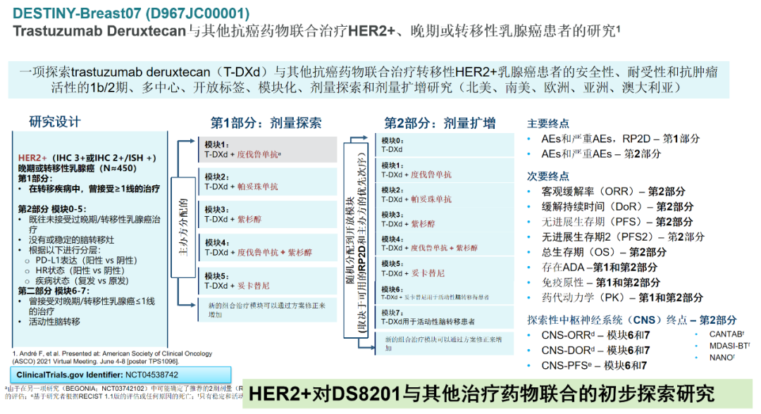 DB-07研究是一项探讨T-DXd联合治疗用于晚期HER2+乳腺癌的1b/2期试验。该研究的第一部分(剂量探索)包括T-DXd+度伐利尤单抗、帕妥珠单抗、紫杉醇、度伐利尤单抗+紫杉醇、图卡替尼等5个模块;第二部分(剂量扩展)则包括T-DXd单药、前述5个模块以及T-DXd单药或联合图卡替尼用于活动性脑转移患者等8个模块(0-7模块)。主要终点是安全性和耐受性,并确定2期推荐剂量(RP2D)。