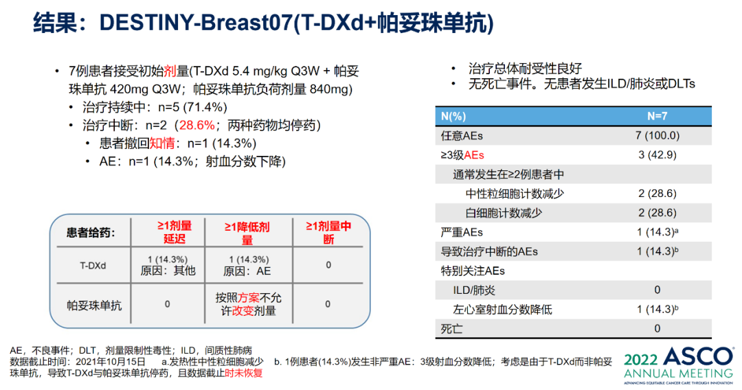 2022年ASCO大会报道了T-DXd+帕妥珠单抗的剂量探索结果,确定该方案的RP2D(T-DXd 5.4 mg/kg Q3W+帕妥珠单抗420mg;帕妥珠单抗负荷剂量840mg),7例患者中有5例(71.4%)仍在治疗中,2例(26.8%)治疗中断(撤回知情和射血分数降低各1例);3例(42.9%)≥3级AEs,没有间质性肺病(ILD)/非感染性肺炎或剂量限制毒性(DLTs)发生,无死亡事件。
