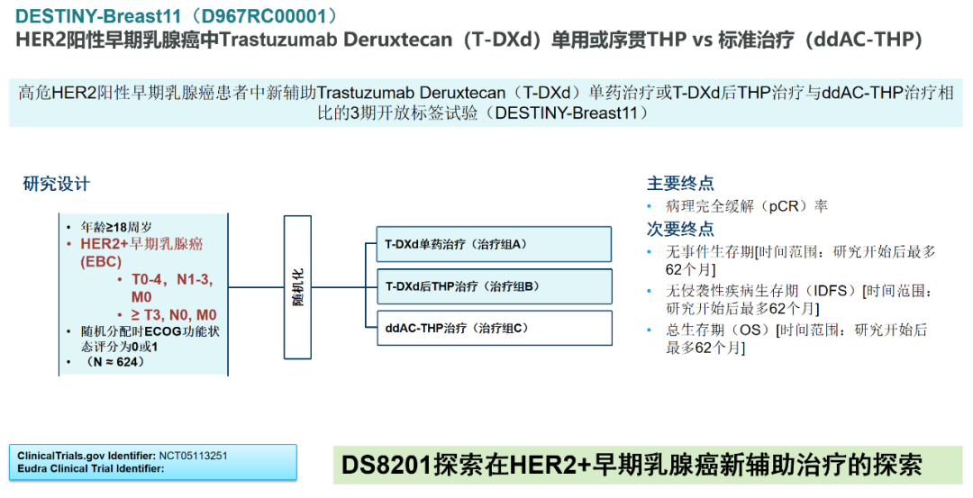 DB-11研究是探讨T-DXd用于HER2+早期乳腺癌新辅助治疗的3期研究,入组患者为HER2+早期乳腺癌(T0-4,N1-3,M0或≥T3,N0,M0),随机接受T-DXd单药治疗(A组)、T-DXd后序贯THP治疗(B组)、ddAC-THP治疗(C组),主要终点是病理完全缓解(pCR)率,次要终点是DFS、无侵袭性疾病生存期(IDFS)、OS。