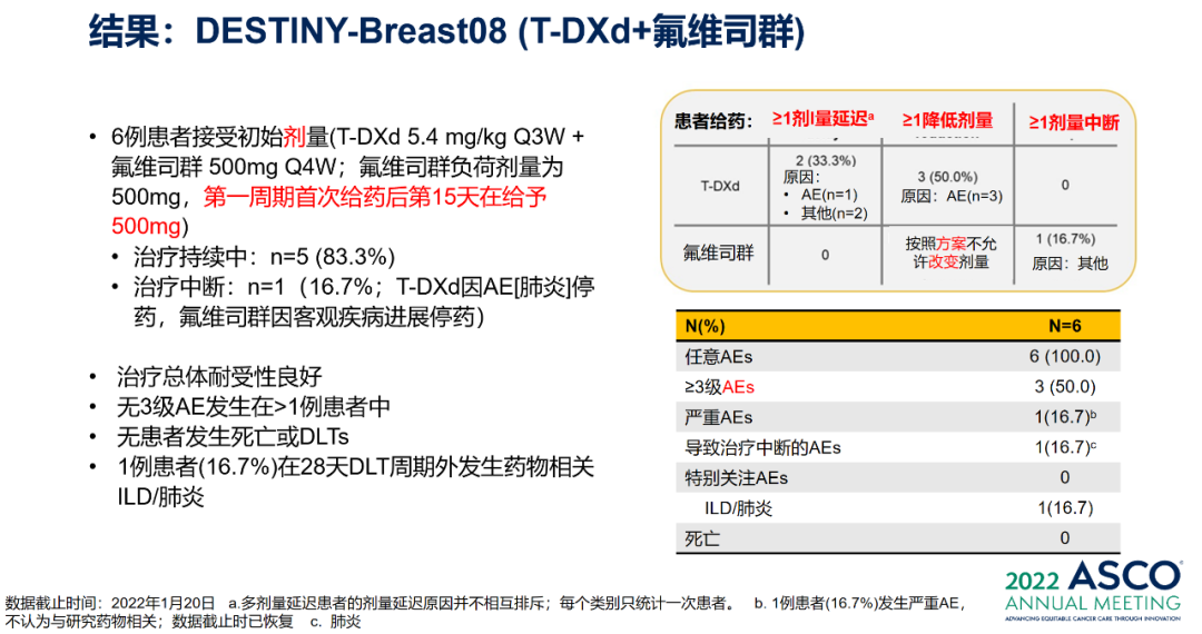2022年ASCO大会报道了T-DXd+阿那曲唑和T-DXd+氟维司群的剂量探索结果。确定RP2D分别为T-DXd 5.4 mg/kg q3w+阿那曲唑1mg/天和T-DXd 5.4 mg/kg q3w+氟维司群500mg q4w(氟维司群负荷剂量为500mg,第一周期首次给药后第15天再给予500mg),结果同样显示总体的治疗耐受性和安全性良好。