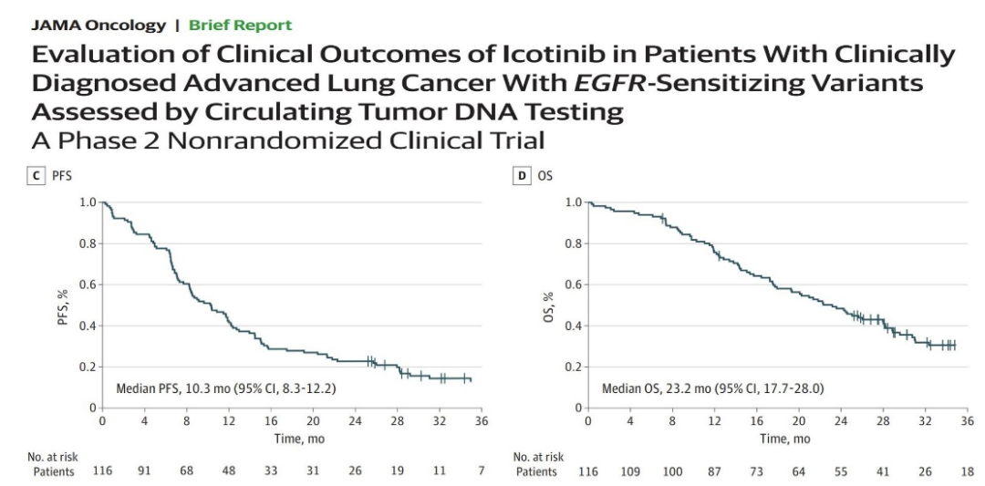 基于组织检测EGFR突变可以指导埃克替尼的应用,那基于外周血检测是否同样可以指导埃克替尼的应用呢?近期,JAMA Oncology杂志发表的一项临床研究(CHALLENGE研究)发现,基于外周血ct-DNA的检测结果同样可以指导埃克替尼的临床应用。在CHALLENGE研究中,研究者共纳入116例患者,患者均诊断为肺癌但无法进一步明确组织分型,所有患者基线ct-DNA均为EGFR突变阳性且既往未接受过治疗。符合入组标准的患者给予埃克替尼治疗。研究发现,患者的ORR率达到52.6%,中位PFS和中位OS分别为10.3个月和23.2个月。从数值上看,与基于组织诊断EGFR突变且给予靶向药物治疗的疗效相似。