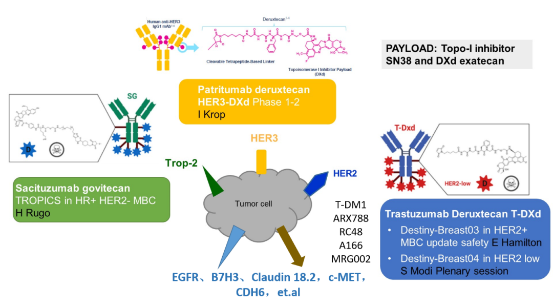 除了针对HER2靶点外,针对其他靶点如TROP2、HER3等的ADC也在紧锣密鼓的开展当中。其中尤以SG、Datopotamab deruxtecan(Dato-DXd;DS-1062)和Patritumab deruxtecan(HER3-DXd;U3-1402)进展较为迅速。针对SG,除ASCENT、TROPiCS-02研究外,更多的Ⅰ~Ⅲ期研究正在开展旨,在探索SG(新)辅助获益以及不同的联合治疗策略。