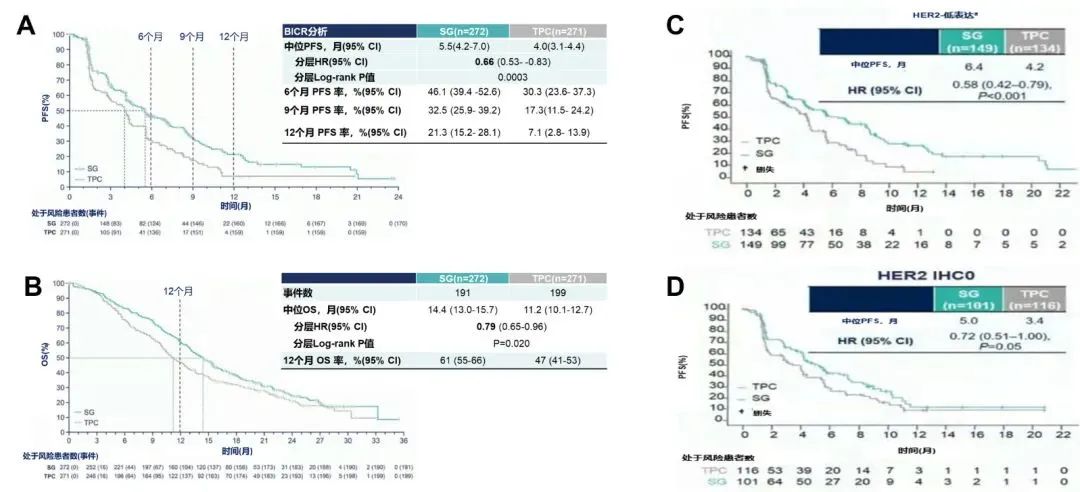 图11.TROPiCS-02研究结果.A:ITT人群的PFS分析;B:ITT人群的OS分析;C:HER2低表达人群的PFS分析;D:HER2 0表达人群的PFS分析