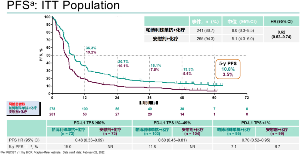ESMO 2022上公布的Keynote407研究5年随访结果显示,帕博利珠单抗+化疗组和安慰剂+化疗组5年OS率分别为18.4%和9.7%,5年PFS率分别为10.8%和3.5%(图4,图5),同样证实了免疫治疗的长期获益。