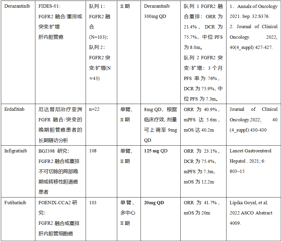 在Ⅱ级推荐中,有两类药物推荐。第一类是针对成纤维细胞生长因子受体(Fibroblast growth factor receptor,FGFR)融合基因的多个抑制剂临床研究结果发表,虽然尚未获得NMPA批准上市,但作为晚期iCCA的重要研究进展和该类药物在治疗中的地位,仍然做了推荐(见附表)。目前共有5种FGFR1-3(4)特异性和选择性抑制剂,其中Futibatinib属于不可逆抑制剂。由于至今有关这类药物的临床研究均是Ⅱ期结果,纳入的患者的数量有限、FGFR1-4融合基因检测方法的不统一性等,其ORR为20.7%~50.0%,mPFS为5.7~7.3个月,FIGHT202研究报道了Pemigatinib的mOS为21.1个月。该类药物的主要不良反应为高磷血症、腹泻和口干等,耐受性良好。其中Pemigatinib由Ⅲ级推荐改为Ⅱ级推荐。