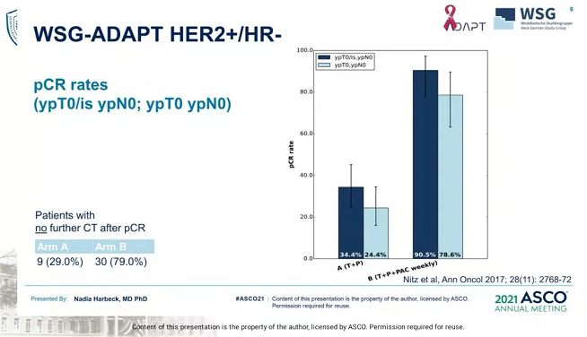 其实新辅助治疗也是很好的平台,例如WSG-ADAPT-HER2+/HR-研究在异质性较低、解剖学分期较早的患者中进行,一组仅用曲帕双靶的无化疗方案,而另一组为曲帕双靶联合紫杉类化疗药物进行治疗。研究结果表明,曲帕双靶治疗组pCR率达34.4%,而曲帕双靶治疗联合紫杉醇组pCR率达到了90.5%,远高于双靶治疗组。在WSG-ADAPT-HER2+/HR-研究中,曲帕双靶治疗组后续多例患者进行了辅助强化治疗。因此,根据目前的数据我们不能明确哪些晚期患者可以免化疗达到pCR,且后续是否能有更好的生存。以上研究为降阶治疗提供了依据,但这些数据仍为相对小样本的探索性研究,我们还需要进行更多的数据积累,从而为今后的治疗带来更多提示。