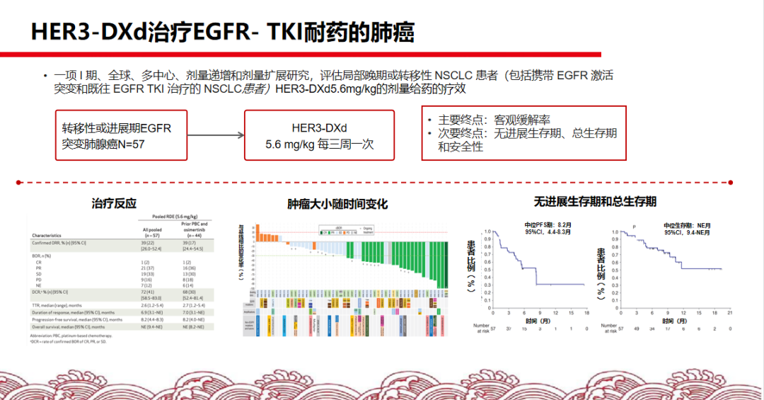 U31402-A-U102研究表明HER3-DXd可逆转EGFR-TKI耐药,目前有多项研究将探讨HER3-DXd用于EGFR突变NSCLC治疗,例如HER3-DXd对比铂类化疗用于EGFR-TKI失败的3期HERTHENA-Lung02研究;HER3-DXd用于后线治疗(至少接受过1种EGFR-TKI和1种铂类)的2期HERTHENA-Lung01研究;HER3-DXd联合奥希替尼用于一线和二线治疗的1期研究(NCT04676477)。