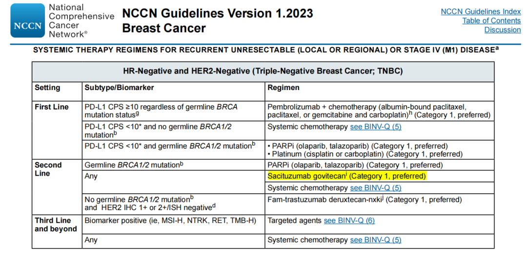 基于TROPiCS-02、ASCENT关键3期临床研究的出色结果,在新近发布的2023年第1版NCCN乳腺癌临床实践指南中,新增戈沙妥珠单抗作为HR+/HER2-内脏危象或内分泌治疗复发患者二线治疗的I类首选方案;同时、仍作为不可切除或转移性三阴性乳腺癌(TNBC)患者二线治疗的I类首选方案[3]