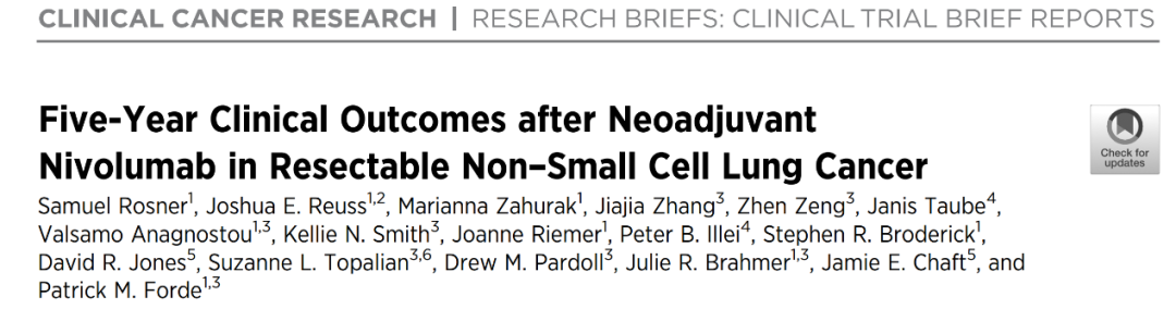 研究目的:针对PD-1的免疫检查点抑制剂新辅助治疗可切除的NSCLC患者展示了良好的前景。前期我们报道了新辅助纳武单抗治疗可切除NSCLC患者的数据,发现这一治疗手段安全且具有令人鼓舞的主要病理学缓解(MPR)。我们报道了本研究随访5年的数据。据我们所知,这是该领域目前最长的随访结果。