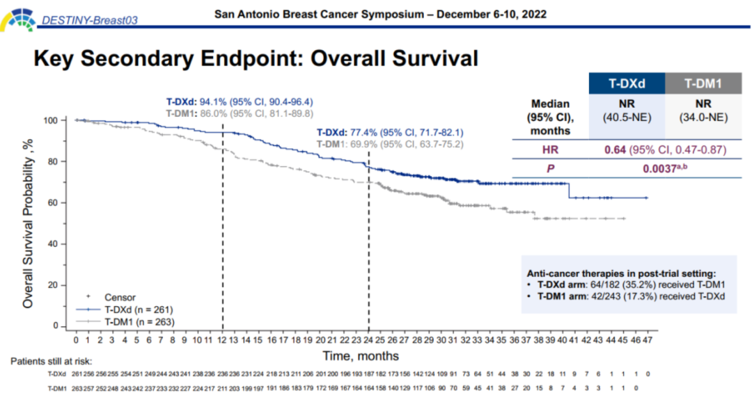 王晓稼教授:因为DESTINY-Breast01研究结果非常出色,ORR和PFS都非常可观,而T-DXd三线治疗的DESTINY-Breast02研究中,PFS和OS也有显著改善。在后线、三线治疗效果这么好的情况下,二线治疗获得阳性结果是理所当然的。所以我们可以看到在DESTINY-Breast03研究中,T-DXd相较于T-DM1的PFS延长了4倍,疾病进展或死亡风险降低67%(28.8 vs 6.8个月;HR 0.33;95%CI:0.26~0.43,P<0.0001);死亡风险则显著降低36%(NE vs NE;HR=0.64;95%CI:0.47~0.87;P=0.0037);ORR翻了一倍多(78.5%vs 35%)。应该说,这样的疗效在二线治疗中是几乎没有的,充分体现了T-DXd应该成为新的二线治疗标准。正如前面所述,作为新一代的ADC药物,T-DXd在连接子的设计、分子毒素的选择等方面都有优势,特别是DAR达到了8:1的比例。这些研究也验证了T-DXd的有效性和安全性。