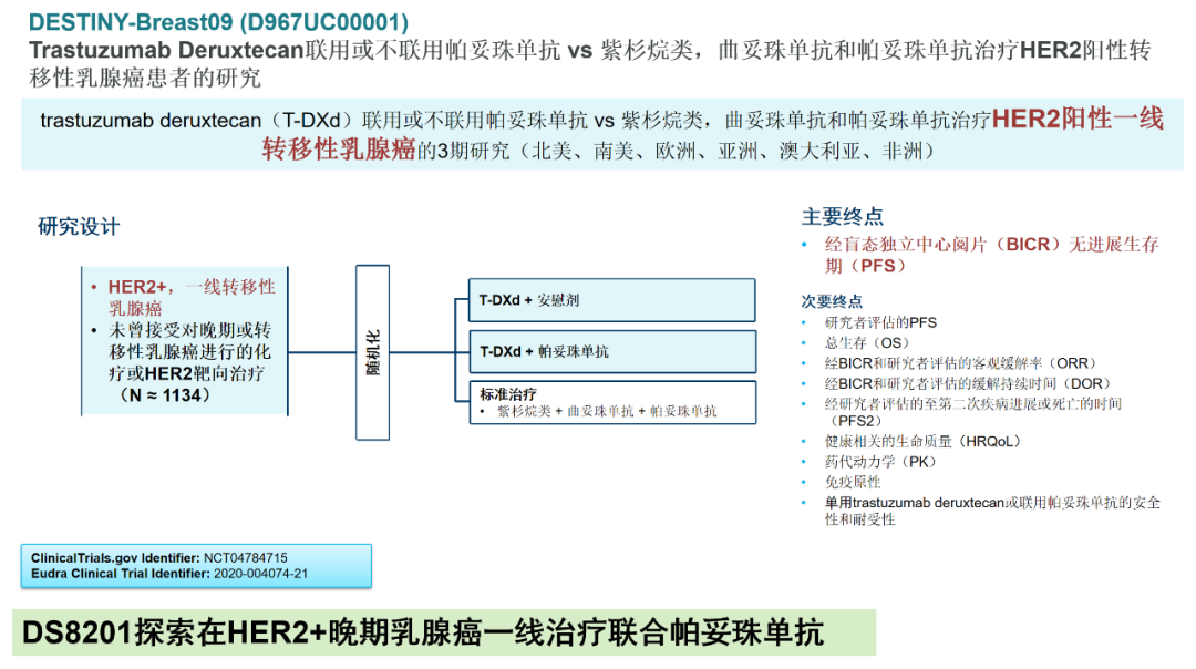 王晓稼教授:正如前面所介绍的,T-DXd从后线到二线治疗的效果非常出色,走到晚期一线治疗应该是理所当然的事情。在国际3期DESTINY-Breast09研究中,T-DXd将直接挑战当前的一项治疗标准“妥妥双靶”(T-DXd单药vs T-DXd+帕妥珠单抗vs THP),应该说这项研究也会获得比较好的结果,因为从既往DESTINY-Breast系列研究的数据来看,基本上都是阳性结果。我们期待DESTINY-Breast09研究的阳性结果能够进一步改变我们目前的临床实践。