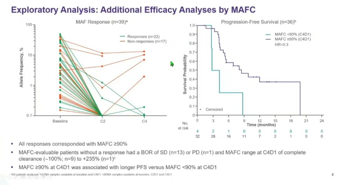 此外,与在C4D1时MAFC<90%相比,在C4D1时MAFC≥90%与较长的PFS相关。基线时的突变等位基因频率(MAF)似乎与疗效无关;