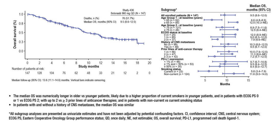 在中位随访13.6个月时,147例KRAS G12C突变晚期NSCLC患者的中位总生存期(OS)为9.5个月(95%置信区间[CI]:8.6-12.0),所有患者均已用尽其他标准治疗;