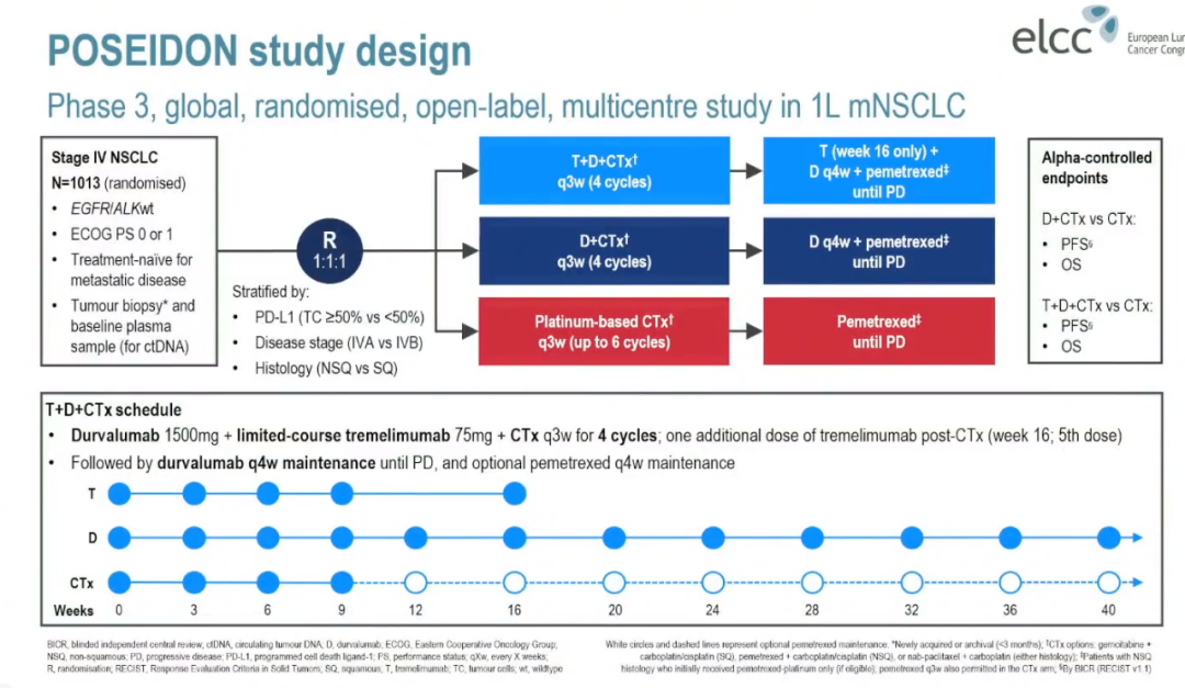 POSEIDON是一项全球性、随机、开放标签、多中心研究。患者纳入标准为EGFR和ALK野生型IV期NSCLC;ECOG体能状态为0或1;既往未针对转移性NSCLC接受过治疗;以及用于循环肿瘤DNA分析的肿瘤活检和基线血浆样本。根据研究设计,1,013例患者按1∶1∶1的比例被随机分配接受①4个周期Tremelimumab+度伐利尤单抗+化疗,在第16周给予第5剂Tremelimumab,然后每4周接受1次度伐利尤单抗维持治疗,直到进展;②度伐利尤单抗+化疗,然后每4周1次度伐利尤单抗维持治疗,直到进展;③最多6个周期的单独化疗。每四周一次培美曲塞维持治疗为可选。