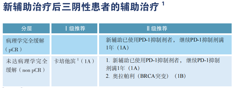 基于KEYNOTE-522研究结果及帕博利珠单抗获批适应症,仅在新辅助治疗中使用PD-1抑制剂的患者,辅助治疗才考虑使用PD-1抑制剂。新辅助治疗中已经使用PD-1抑制剂的三阴性乳腺癌患者,术后是否达pCR,术后都可以继续使用PD-1抑制剂满1年(1A),使用过程中应严格监测患者的不良反应。