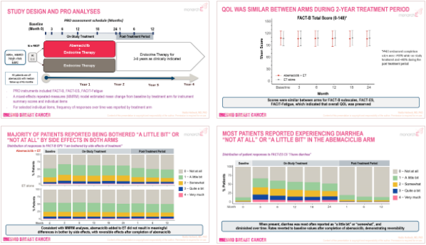 2023年ESMO BC于5月11日-13日在德国举办,一项monarchE的重要次要研究终点-患者报告结局的报道也在此次会议的第1天即5月11日以mini oral形式揭晓(93MO-Long-term patient-reported outcomes from monarchE:Abemaciclib plus endocrine therapy for adjuvant HR+,HER2-,node-positive,high-risk,early breast cancer(EBC)),为阿贝西利辅助强化治疗再添力证。
