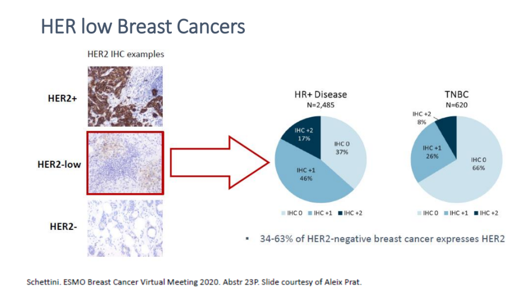 随着科学研究的进步和对疾病理解的深入,目前可以将人表皮生长因子受体2(HER2)状态分为3类,即HER2阳性(HER2 IHC 3+或HER2 IHC 2+且FISH+)、HER2低表达(HER2 IHC 1+/2+且FISH-)和HER2阴性(HER2 IHC 0)。研究发现HER2低表达患者人数并不少;在激素受体阳性(HR+)患者中,HER2低表达占到63%;而在三阴性乳腺癌(TNBC)患者中,HER2低表达占到34%[1]。