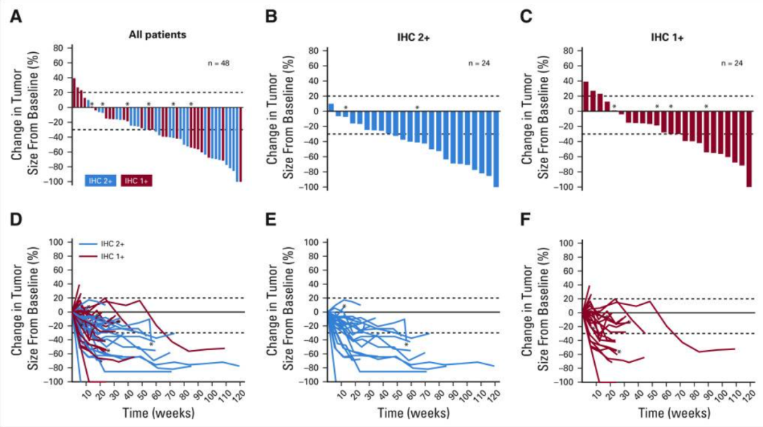而I期探索研究DS8201-A-J101[3]则首次证实了T-DXd治疗HER2低表达人群的疗效。该研究共纳入54例HER2低表达患者,分别来自于第1部分、2c和2e队列。这些患者中位治疗线数为7.5线,在既往抗HER2标准治疗失败后接受T-DXd治疗,客观缓解率(ORR)为37%,疾病控制率(DCR)为87%,中位无进展生存期(PFS)达到11.1个月。且T-DXd对IHC 2+和IHC 1+低表达患者均有效。