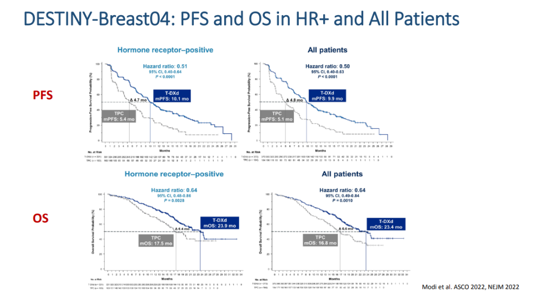 随后DB04临床试验对T-DXd治疗HER2低表达晚期乳腺癌的疗效和安全性进行了进一步探索。在2022 ASCO大会上公布的初步结果[4]显示,在HR+患者中,T-DXd治疗组中位无进展生存期(mPFS)相较于研究者选择化疗(TPC)治疗延长4.7个月(10.1 vs 5.4个月),疾病进展或死亡风险显著降低49%(HR 0.51,95%CI:0.40~0.64,P<0.001);总人群的mPFS为9.9个月(HR 0.50,P<0.0001),mOS为23.4个月(HR 0.64,P=0.0010)。整体上不同亚组患者PFS获益趋势一致,并且T-DXd还延缓了患者生活质量的恶化。对于总体安全性、暴露时间调整后的不良事件(AE)发生率,T-DXd组均优于TPC组。基于卓越的研究成果,目前T-DXd已成为HER2低表达HR+/HR-转移性乳腺癌的新标准治疗。