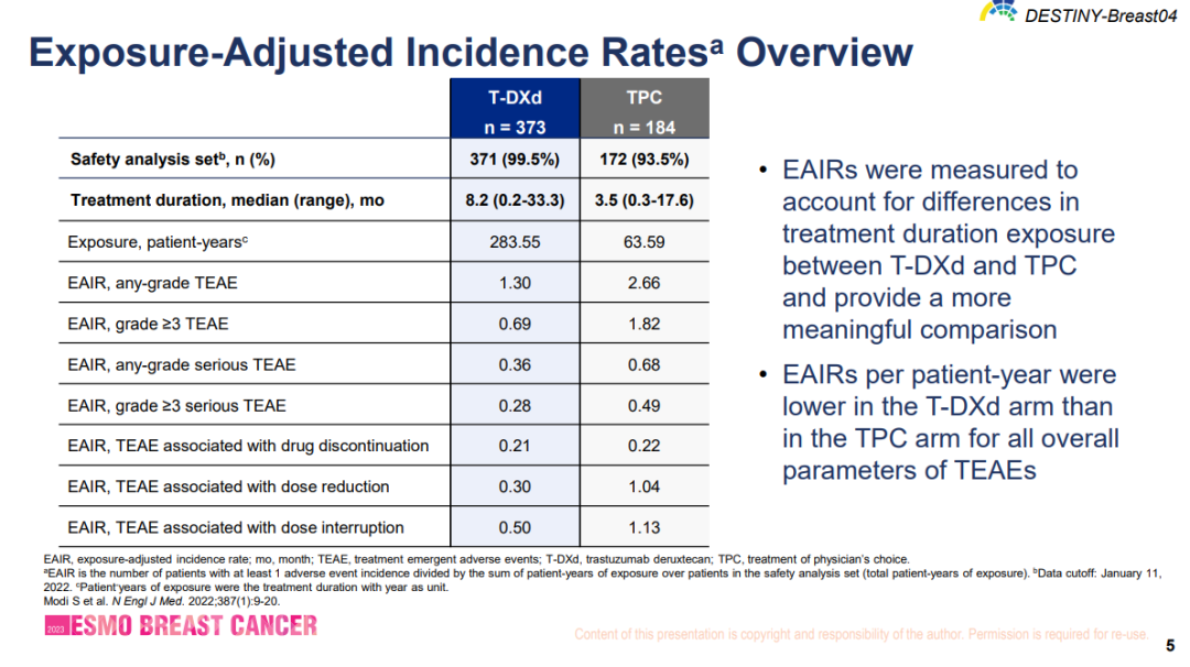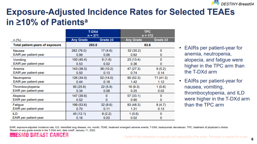 在DB04中,暴露校正发生率(EAIR)可以分析T-DXd和TPC两组之间的暴露持续时间差异;T-DXd组的中位治疗持续时间为8.2个月(0.2-33.3个月),TPC组则为3.5个月(0.3-17.6个月)。T-DXd组任意级别TEAE的EAIR均低于TPC组(1.30 vs 2.66),同时≥3级TEAE更低(0.69 vs 1.82),包括贫血、中性粒细胞减少症、脱发和疲劳,但恶心、呕吐、血小板减少和ILD的EAIR发生率略高于TPC组。