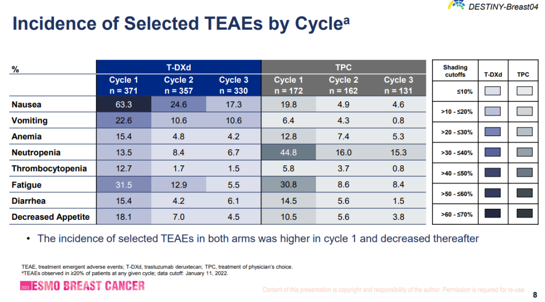 两组治疗方案在第1周期的TEAE发生率较高,此后均有明显下降。T-DXd治疗组中的前三种TEAE为恶心(63.3%)、疲劳(31.5%)和呕吐(22.6%),TPC组前三种TEAE为中性粒细胞减少症(44.8%)、疲劳(30.8)和恶心(19.8%)。
