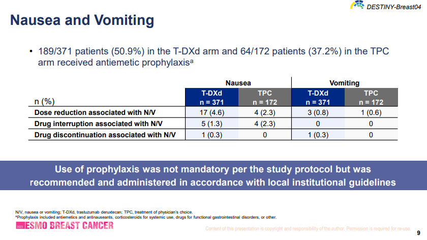 T-DXd组和TPC组的恶心/呕吐事件发生率较高,T-DXd组患者接受止吐预防治疗(189/371,50.9%)的比例高于TPC组(64/172,37.2%)。
