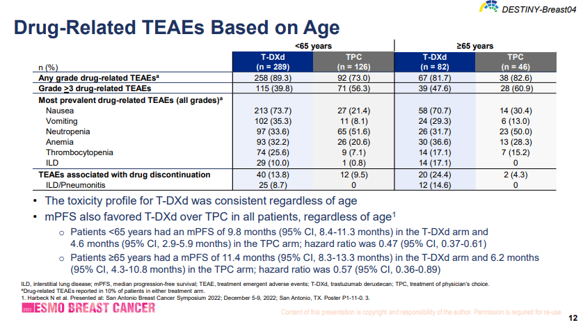 同时研究也发现,在不同年龄组的患者中,T-DXd组的mPFS均优于TPC组。在<65岁的患者中,T-DXd组的mPFS高于TPC组5.2个月(9.8个月vs 4.6个月,HR=0.47,95%CI 0.37-0.61)。而在≥65岁人群中,T-DXd组的mPFS也高于TPC组5.2个月(11.4个月vs 6.2个月,HR=0.57,95%CI 0.36-0.89)。且无论是≥65岁还是<65岁的患者中,T-DXd组的≥3级TEAE发生率均更低。
