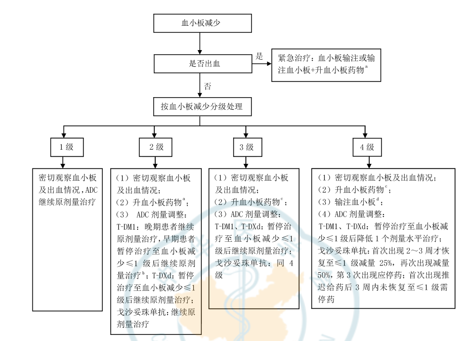 EMILIA临床研究[6]表明,T-DM1治疗期间血小板减少不良反应发生率较高。《中国乳腺癌抗体药物偶联物安全性管理专家共识》中对于ADC治疗相关血小板减少的常规对症处理流程如下图所示[7]。建议给药前监测血小板计数;密切监测血小板减少情况并按照血小板减少情况分级处理。血小板减少>2级时给予升血小板药物;4级时可考虑输注血小板,必要时请血液科会诊。