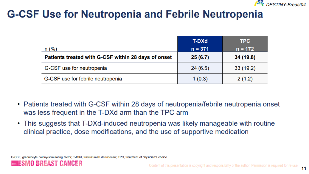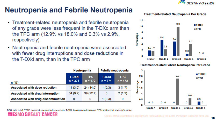 T-DXd组与TPC组相比,任意级别的治疗相关中性粒细胞减少症和发热性中性粒细胞减少症发生率较低(12.9%vs 18.0%,0.3%vs 2.9%),需要使用集落刺激因子的比率也更低(6.5%vs 19.2%,0.3%vs 1.2%),与T-DXd组较低的药物中断(9.2%vs 22.7%,0 vs 1.2%)和剂量减少次数(3.0%vs 14.0%,0.3%vs 1.7%)相关。
