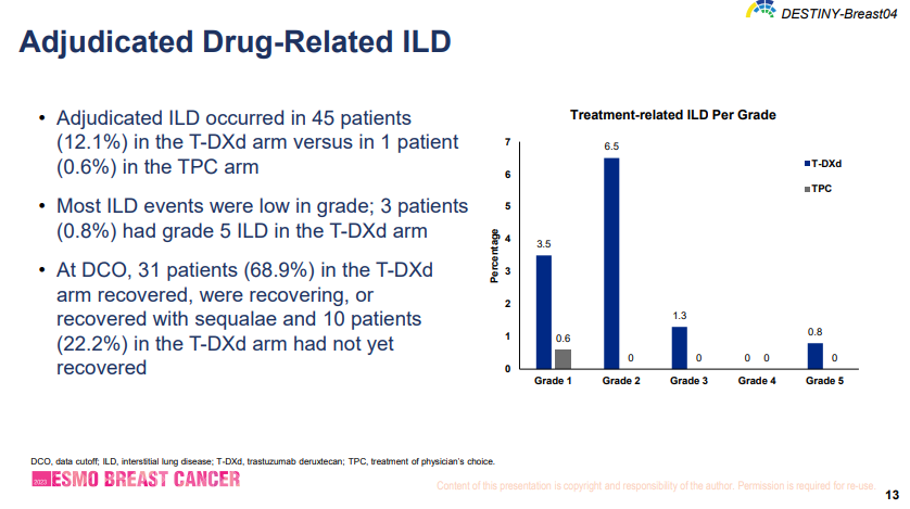 T-DXd组的45例(12.1%)患者发生ILD,而TPC组有1例(0.6%)。大多数ILD事件为1-2级,其中有3例患者出现了5级的ILD(0.8%);在数据截止(DCO)之前,T-DXd组中31例(68.9%)患者已经康复、正在康复或部分康复,仍有10例(22.2%)尚未康复。6例1级ILD患者(由研究者评估)恢复后再次接受治疗;其中1例患者发生了第二次ILD事件,再次发生时为2级。