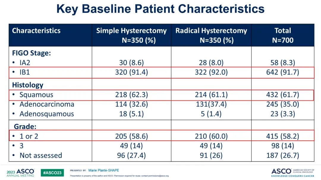 SHAPE试验纳入700名低风险IA2或IB1期宫颈癌患者,患者按1:1随机分入根治性子宫切除术和单纯性子宫切除术两组。两个手术组都包括盆腔淋巴结清扫和可选的前哨淋巴结(SN)定位。
