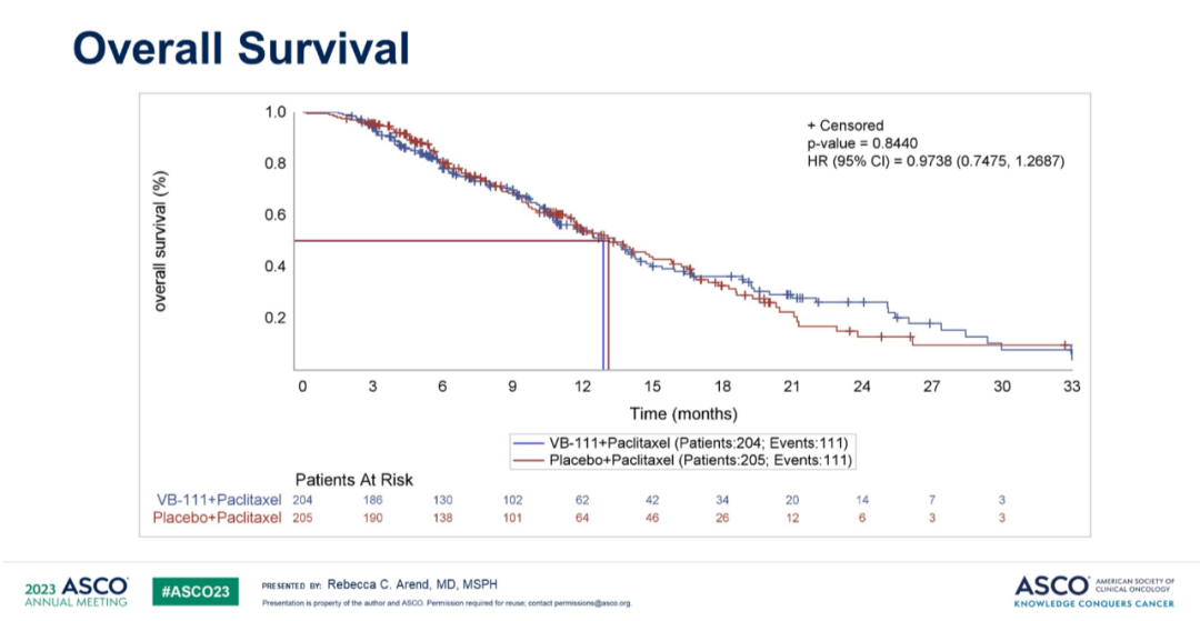 VB-111组和对照组的中位OS为13.37个月vs. 13.14个月(HR=0.97,95%CI: 0.75-1.27,p=0.8440)。
