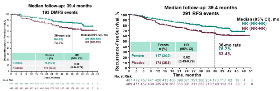 976例患者随机分配至帕博利珠单抗组(n=487)或安慰剂组(n=489)。中位随访时间(随机化至数据截止日期)为39.4个月(范围:26.0~51.4)。与安慰剂相比,帕博利珠单抗辅助治疗改善了患者的DMFS(中位DMFS:未达到;HR 0.59,95%CI:0.44~0.79)和RFS(中位RFS:未达到;HR 0.62,95%CI:0.49~0.79)。帕博利珠单抗辅助治疗的36个月DMFS率(84.4%vs 74.7%)和RFS率(76.2%vs 63.4%)更高。