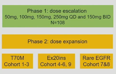 该研究为I期临床试验,纳入携带EGFR-T790M或其他罕见突变的经治NSCLC患者,剂量扩增阶段纳入携带EGFR ex20ins突变的经治或初治的晚期/转移性NSCLC患者。研究者以50mg/d、100mg/d、150mg/d、200mg/d到250mg/d的剂量给药(3+3设计)。截止至2022年10月31日,共入组108例受试者,其中初治EGFR ex20ins突变患者(队列6)有28例。