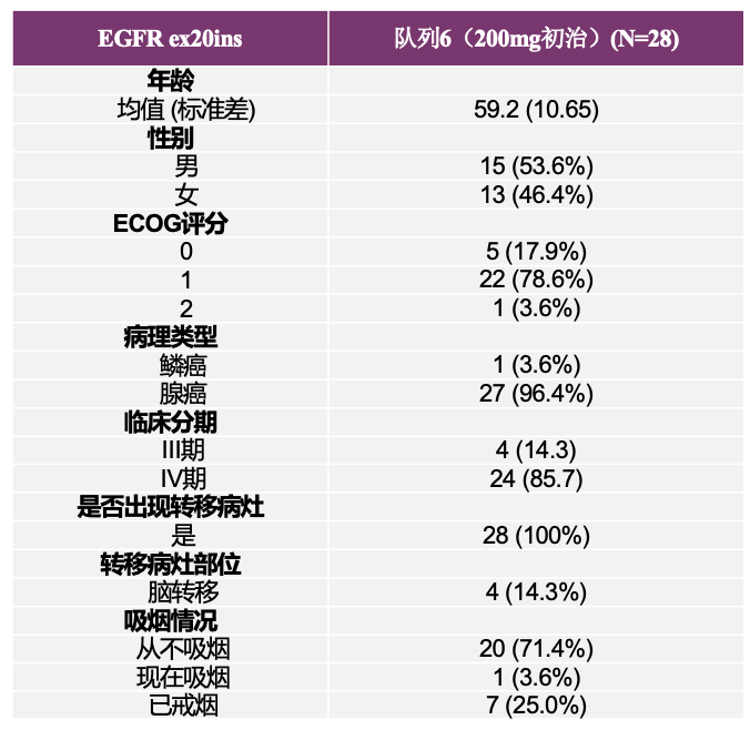EGFR ex20ins初治、治疗剂量为200mg的患者(队列6,N=28)中,患者的平均年龄为59岁,大部分患者为IV期腺癌,所有患者出现转移病灶,其中有4例出现脑转移。