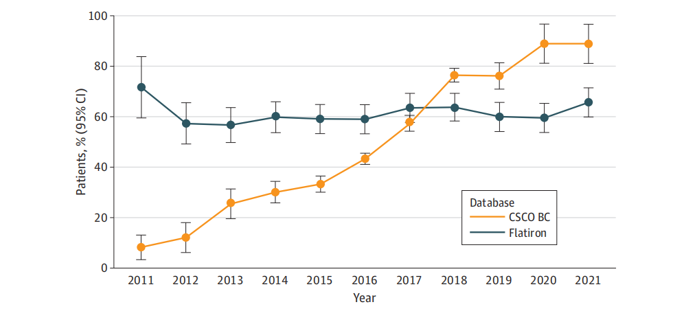 分析过程中我们看到,随着十几年来中国学术水平的进步和综合国力的增强,在HER2阳性乳腺癌靶向治疗过程中,我们有了很大的进步。20多年前(曲妥珠单抗未在中国上市),HER2阳性乳腺癌没有靶向治疗药物;帕妥珠单抗未在中国上市之前,HER2阳性乳腺癌只有单靶(曲妥珠单抗)治疗,而帕妥珠单抗进入医保以后,曲帕双靶成为了HER2阳性乳腺癌患者治疗的重要方案。我认为这是行业政策、医保政策和CSCO BC等相关指南共同作用的结果。数据分析还发现,2017年后曲妥珠单抗治疗在中国快速增长,比例反超美国,分别有1684[68.5%]例与550[62.5%]例的HER2阳性早期乳腺癌患者接受曲妥珠单抗治疗。而2011年至2016年,CSCO BC数据库中曲妥珠单抗的使用比例显著低于Flatiron数据库(1336[36.3%]vs.589[58.6%],P<0.001)。与此同时,2017年后中国患者新辅助治疗的比例也明显上升。